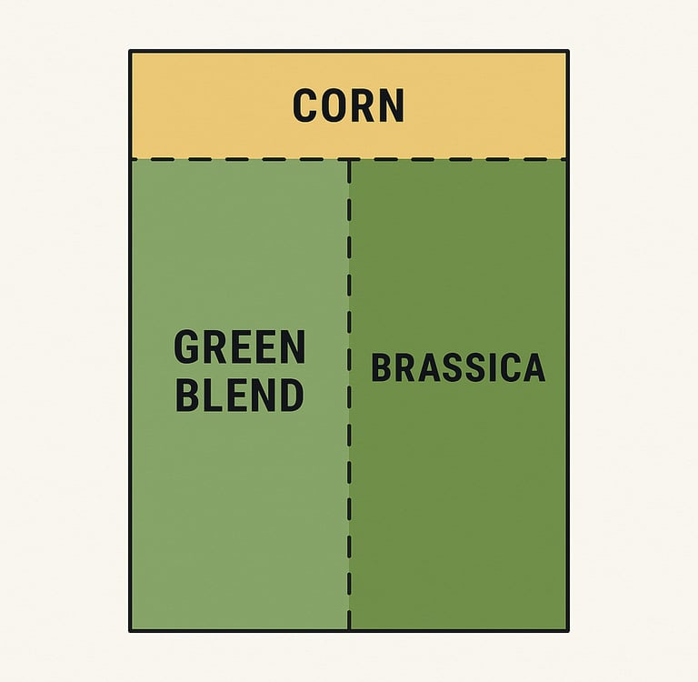This method divides a green food plot into two equal halves: Half in brassicas, half in a blended green mix.